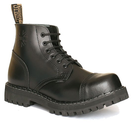 3 dírkové boty STEEL (rock style), výška 17 cm, stíraná barva. Celokožené s ocelovou špičkou a trojitými švy. Podrážka je vyrobená z klasické tvrzené gumy s traktorovým vzorem a ozdobnými šrouby a plíškem s nápisem Steel. Bavlněné nebo voskované tkaničky.
