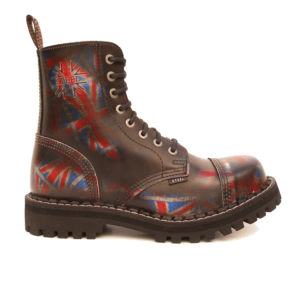8 dírkové boty STEEL (rock style), výška 21 cm, stíraná barva. Celokožené s ocelovou špičkou a trojitými švy. Podrážka je vyrobená z klasické tvrzené gumy s traktorovým vzorem a ozdobnými šrouby a plíškem s nápisem Steel. Bavlněné nebo voskované tkaničky.