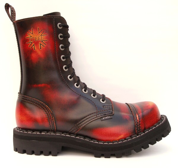 10 dírkové boty STEEL (rock style), výška 23-25 cm. Celokožené (broušená kůže) s ocelovou špičkou a trojitými švy. Podrážka je vyrobená z klasické tvrzené gumy s traktorovým vzorem, ozdobnými šrouby a plíškem s nápisem Steel. Bavlněné nebo voskované tkaničky.