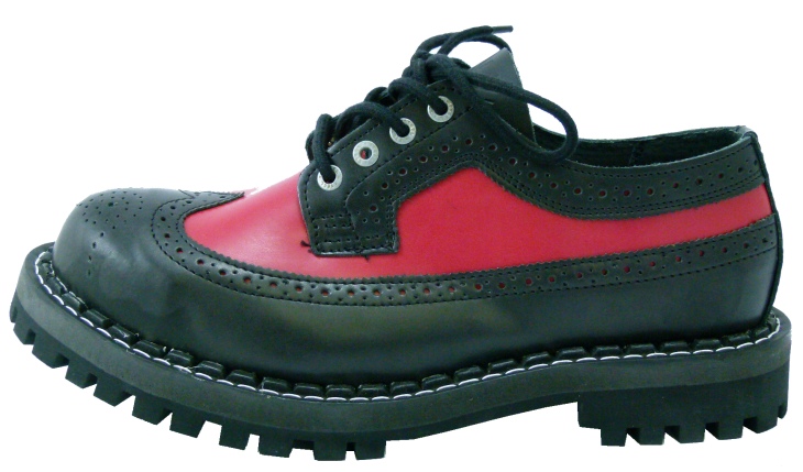 3 dírkové boty STEEL (rock style), výška 10 cm. Celokožené s ocelovou špičkou a trojitými švy. Podrážka je vyrobená z klasické tvrzené gumy s traktorovým vzorem a ozdobnými šrouby a plíškem s nápisem Steel. Bavlněné nebo voskované tkaničky.