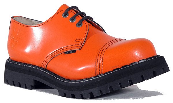 3 dírkové boty STEEL (rock style), výška 10 cm. Celokožené s ocelovou špičkou a trojitými švy. Podrážka je vyrobená z klasické tvrzené gumy s traktorovým vzorem, ozdobnými šrouby a plíškem s nápisem Steel. Bavlněné nebo voskované tkaničky.